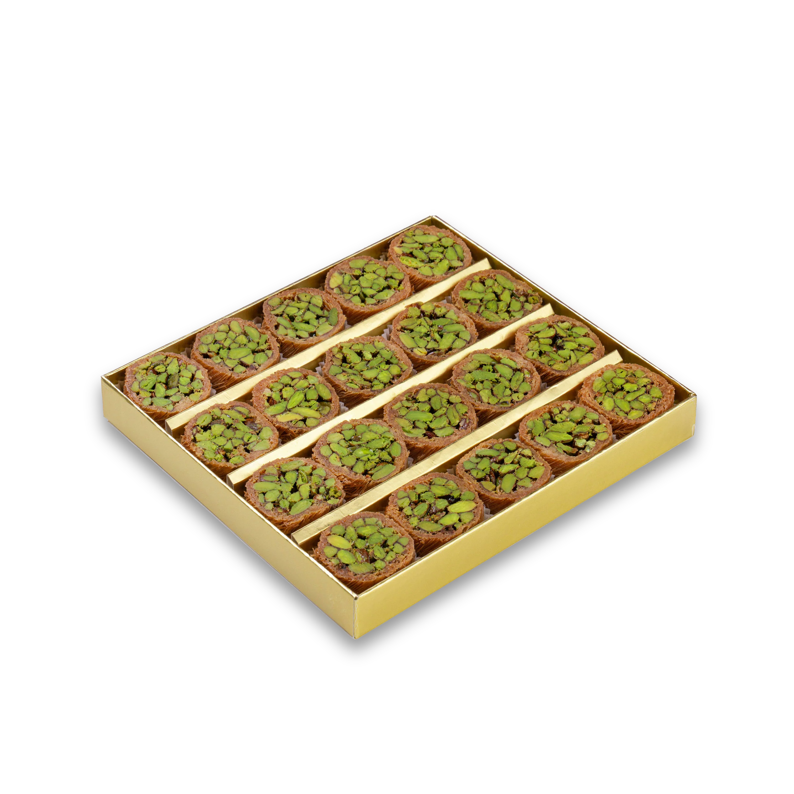 Charisma Mabruma – ein charmanter orientalischer Kreis aus feinen Fadenteigsträngen, kunstvoll um eine luxuriöse Pistazienfüllung gewickelt. Der knusprige Teig, kombiniert mit dem reichhaltigen Aroma der Pistazien, sorgt für ein unvergessliches Geschmackserlebnis. Ideal als edles Geschenk oder zum Genießen bei besonderen Anlässen.